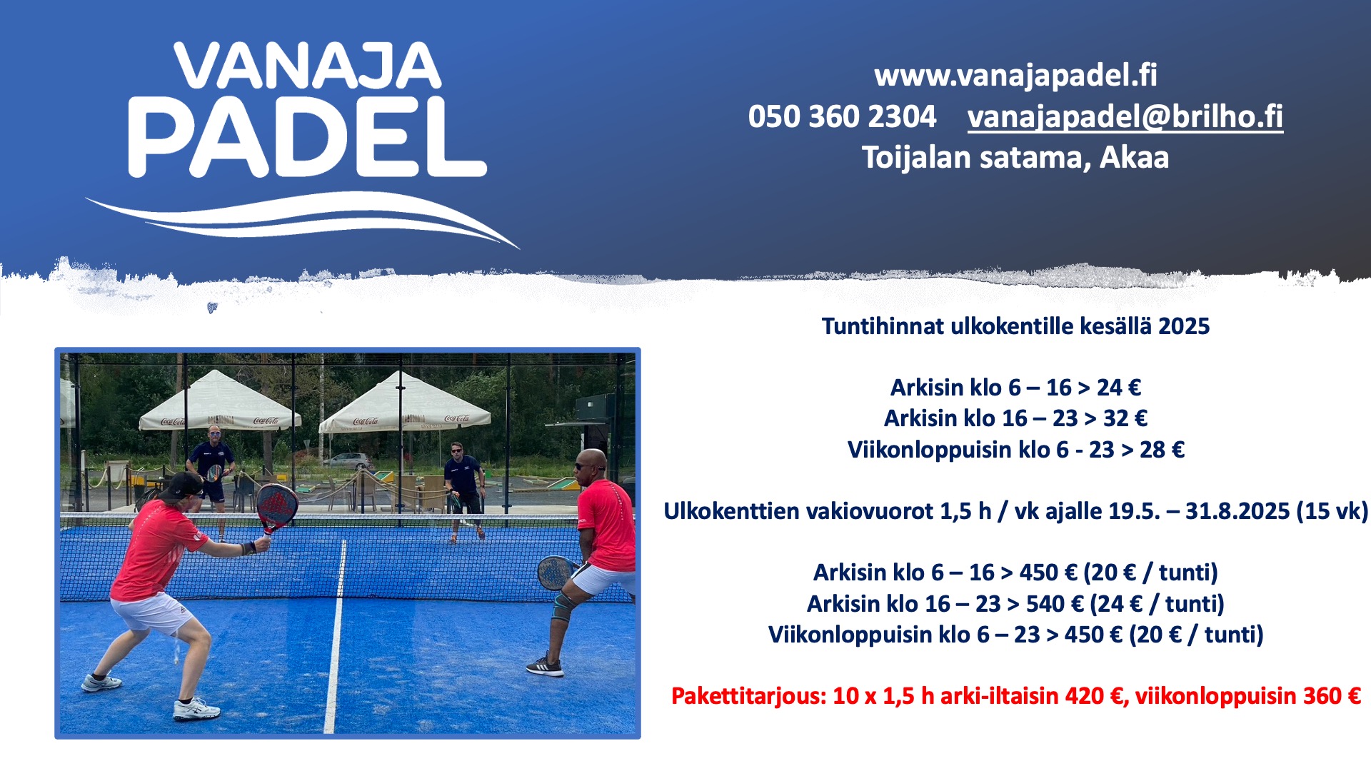 Kahden kentän padelhallin tuntihinnat kaikkina viikonpäivinä klo 6 – 15 ovat 26 €,